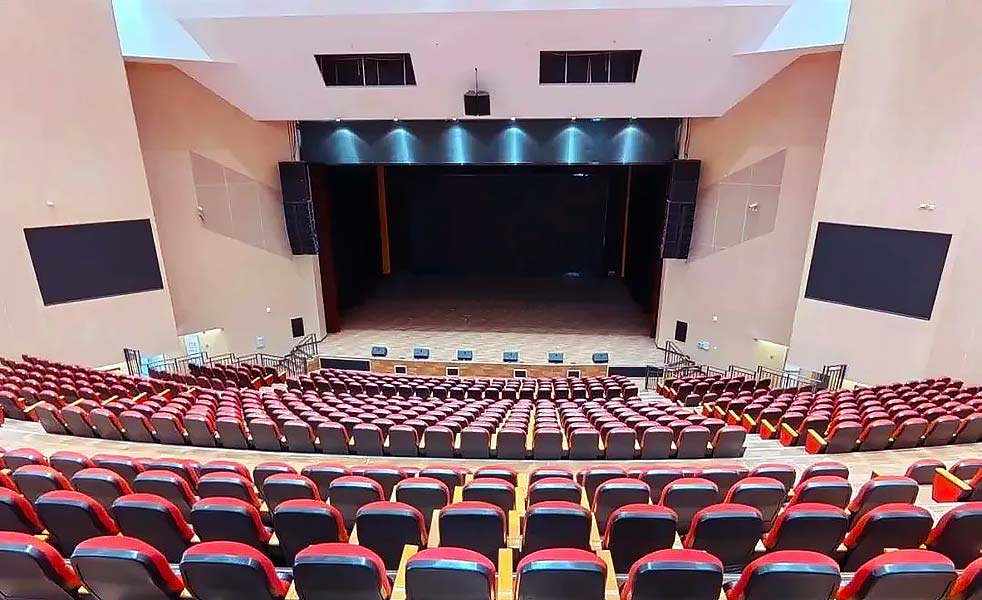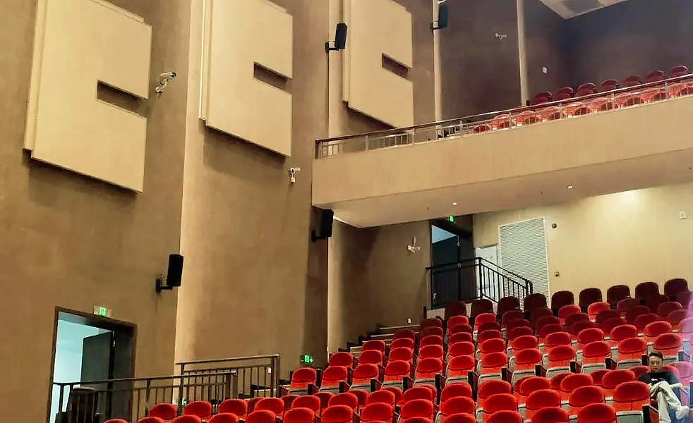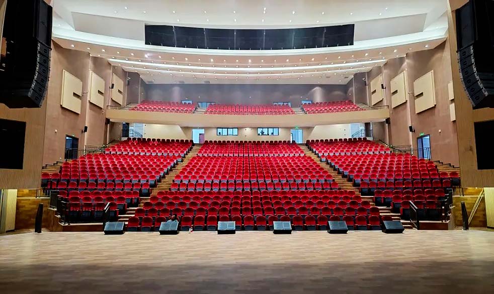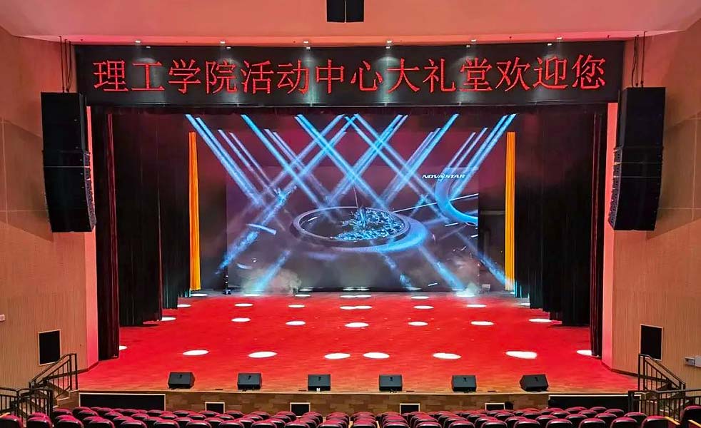 貴州理工學院貴安校區師生活動中心大禮堂采用12只LAX OP3122雙12寸線性陣列揚聲器作為整個大禮堂的主擴聲系統,配套4只ST218BP雙18寸可吊掛陣列式超低頻揚聲器作為低頻擴展,使用2只TR115單15寸揚聲器隱藏于聲橋內作為中置聲道揚聲器,地面擺放4只為增加大禮堂的低頻表現力及震撼感,使用4只S218B超低揚聲器落地式擺放做為低頻動態擴展使用。