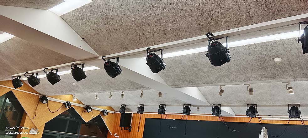 燈光系統由兩道頂光、兩道測光組成。每道頂光由8臺帕燈組成,每道測光由4臺帕燈組成,打向講臺。