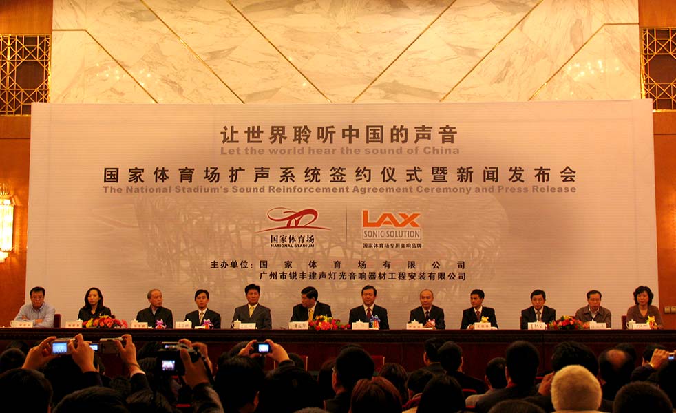 2006年12月8日,LAX以唯一一家中國品牌的身份擊敗國內(nèi)外競爭對手,簽約成為國家體育場“鳥巢”專用音響品牌,實(shí)現(xiàn)了奧運(yùn)主場館采用中國音響零的突破。隨后更是拿下了近1/6的北京奧運(yùn)比賽場館擴(kuò)聲工程項(xiàng)目。“鳥巢”共使用236只雙十二寸全頻線陣列揚(yáng)聲器,均勻覆蓋觀眾席與場地區(qū)域。