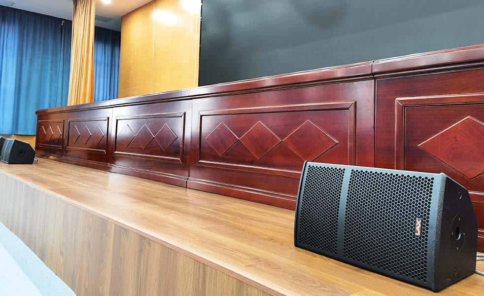 報告廳舞臺區(qū)域,采用單15寸二分頻單驅(qū)動全頻音響擔當主擴聲揚聲器,吊掛安裝于舞臺兩側(cè),每邊2只排列,調(diào)整一定角度,打向觀眾區(qū)。舞臺兩側(cè)分布2只臺唇補聲音響、2只反聽音響及超低音音響,觀眾區(qū)兩側(cè)和后面均勻吊掛4只輔助音響,保證劇院觀眾區(qū)域聲場的均勻覆蓋,使全場各聽音位置都擁有同樣的聽感。