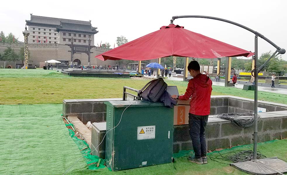 西南城角“嗨皮·陜博”光影秀,LAX AF110-P線陣列音箱搭配LAX AFL18B-P超低揚聲器使用,數字音頻處理器是DSP36而功放機產品是MT1300。PS108全天候全頻音箱作為返聽揚聲器,使用的是MPA4-500功放。