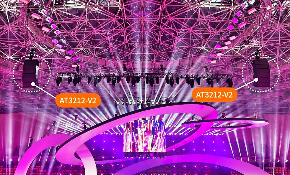 觀眾席選用大型活動常用的AT3212-V2+WS218B雙12線陣搭配雙18超低。4只線陣作為全頻覆蓋對應觀眾席區域,下面1只覆蓋一層的觀眾,上面3只較小的角度組成陣列,集中能量覆蓋二層觀眾席。共使用了48只LAX-AT系列3212-V2雙12寸線陣揚聲器、26只WS218B雙18超低揚聲器為主擴聲系統。