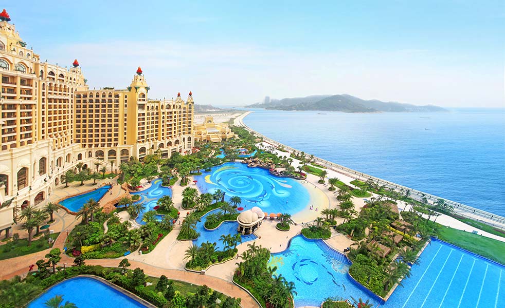 酒店坐落于蜿蜒逶迤的海岸線上,正面臨海,隔岸遙望澳門特別行政區,總建筑面積達30萬平方米,擁有1888間寬敞豪華的客套房,猶如一座海洋城堡。設計師將海洋主題融入了酒店每一個角落, 豐富的海洋元素和獨樹一幟的海豚主題風格,將使其躋身全球一流海洋主題酒店行列。 酒店擁有國內首個酒店海豚池,每日開設海豚科普學堂,賓客可近距離觀看海豚喂食,了解海洋精靈的生活習性。酒店擁有海灘花園和室內外水世界,設有刺激滑道、親子水寨、按摩池、漂流河等多種豐富水上娛樂項目。