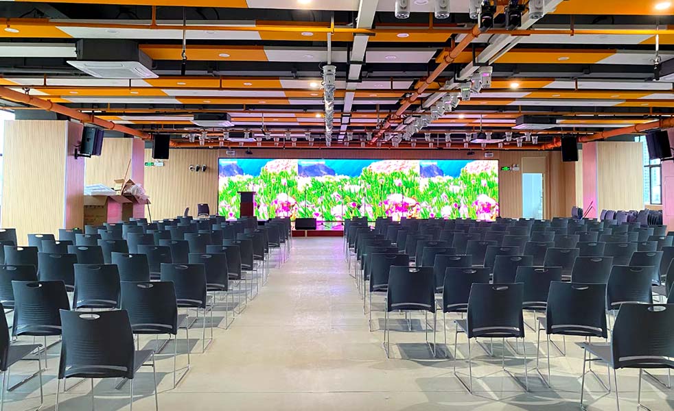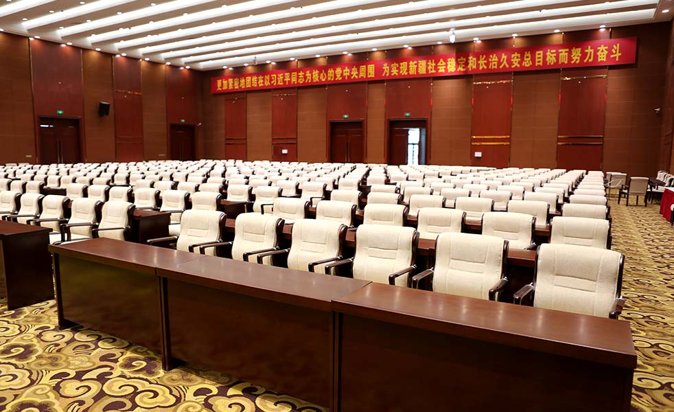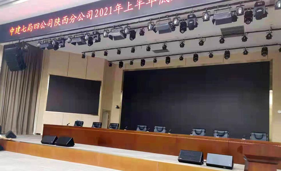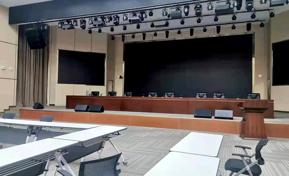 第一師阿拉爾市現代農業高技能人才公共實訓基地會議室擴聲設備提供、安裝、調試及技術支持服務。主擴音響選用AT線陣系列,吊掛在舞臺兩側。