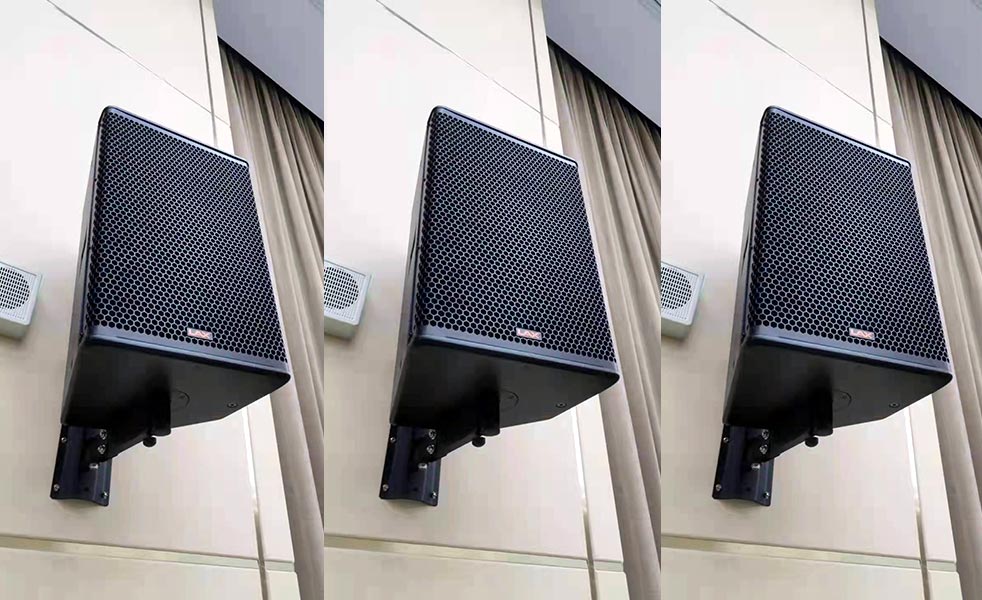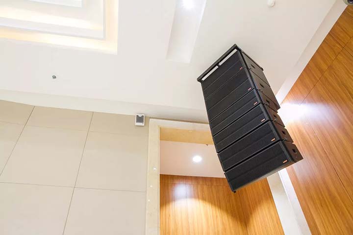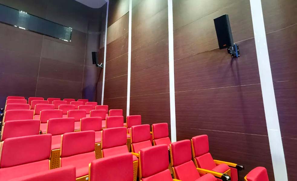 此多功能廳主擴聲采用8只AT系列兩分頻兩驅動單8寸線陣列音箱,4只Live One M返聽組成;AT系列專業全頻音箱,聲壓級高,失真率低,聲音飽滿自然;多功能廳四周環繞采用4只FP12+音箱輔助補聲,均勻分布全場,使整個聲場更均勻集中清晰