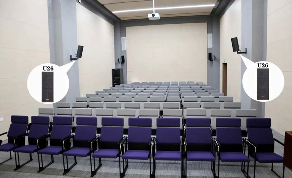 針對多功能廳的聲場特點,采用了6只雙6.5寸兩分頻全頻揚聲器作為會場主擴聲,充分發揮了此系列音箱指向性強的特點。搭配4只補聲揚聲器U04,使得整個多功能廳聲場分布均勻、具有優良的動態、人聲清晰飽滿有層次感,無論是學術報告還是大課演講,LAX都有力的保障了學校日常工作的正常開展。