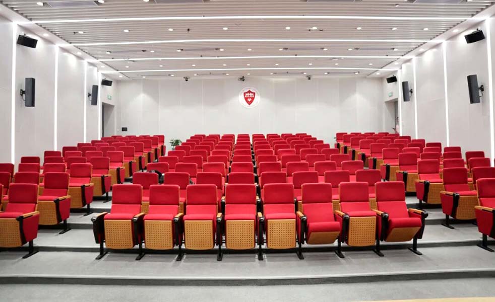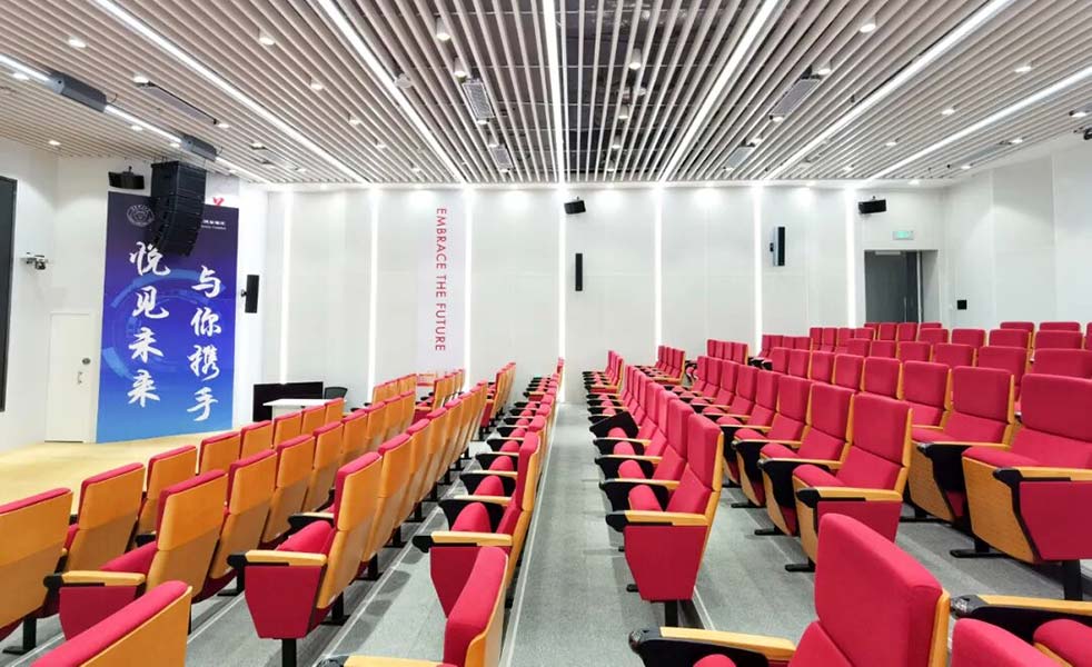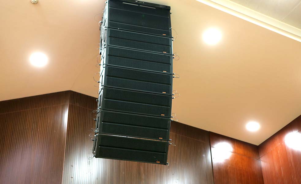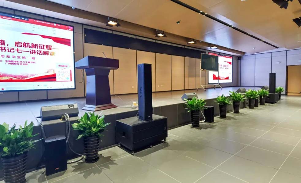 在聲場條件基本滿足的情況下,音箱的擺位設計尤為關鍵,LAX技術團隊為其安裝了PTL系列揚聲器作為左右主擴聲,讓聲音更多地直接傳達給聽眾。為了讓臺上的領導或師生,能夠更好地聽清自己的聲音,采用Live oneM作為舞臺返送揚聲器,讓講者盡情,從而使他們能夠更好地發揮。